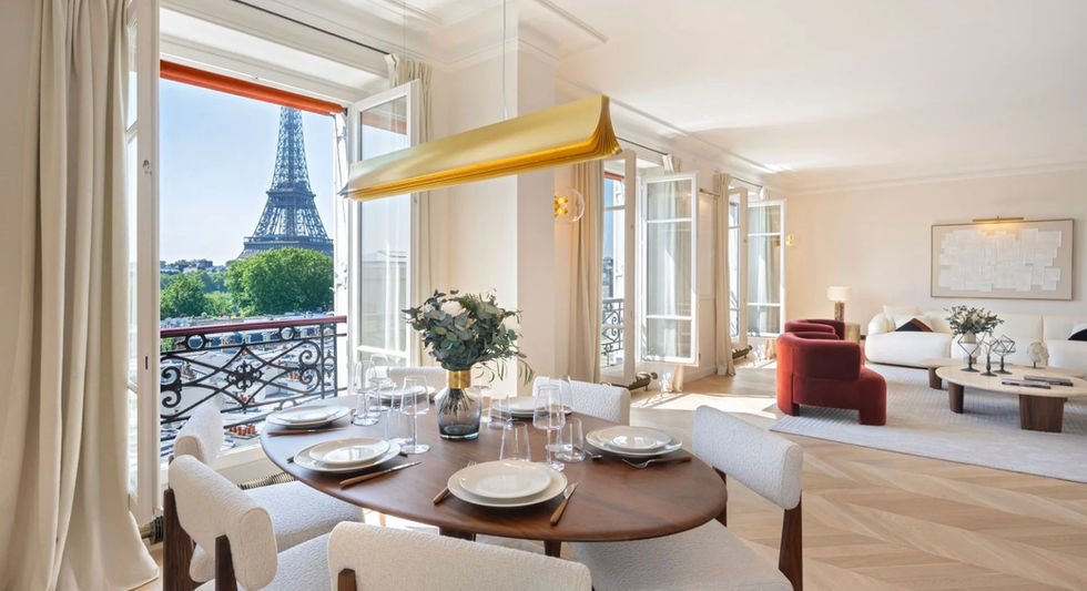 Step through the foyer to enjoy incredibly close-up views of the Eiffel Tower from the elegant living and dining areas. The apartment blends classic elements of traditional Parisian architecture (hardwood floors, decorative moldings, high ceilings) with the comforts and conveniences of modern living.